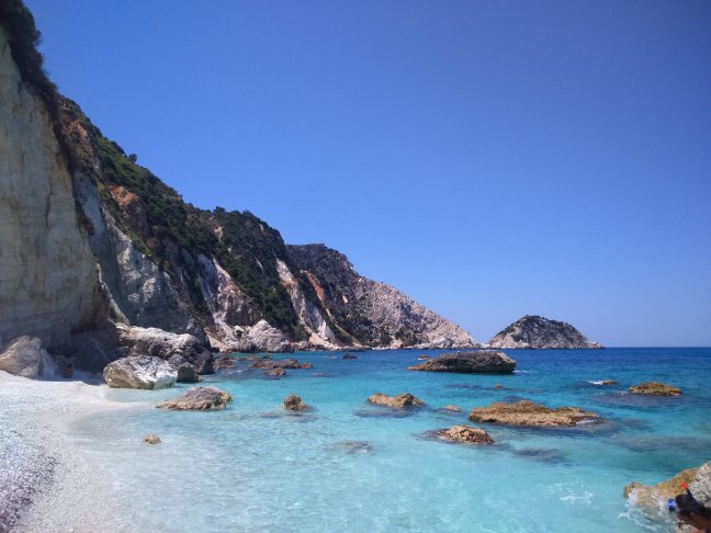 200 km dalej na północ, po zapłaceniu miliona monet ładujemy się na wielki prom, którym po półtorej godziny dopływamy do Poros – portu na idyllicznej wyspie Kefalonia. Kefalonia to jedna z pięciu (obok Zakyntos, Leukady, Korfu i Itaki) Wysp Jońskich, mało popularna jeszcze w Polsce, oferująca niebiańskie plaże oraz krajobrazy zapierające dech w piersiach. Na przestrzeni wieków wyspa przechodziła z rąk do rąk – władali nią Grecy i Rzymianie, później Normanowie, a także Turcy i Wenecjanie. Niestety większość wytworów kultury materialnej wytworzonej przez tych władców pochłonęło trzęsienie ziemi w 1953 roku. Nas interesują plaże, krajobrazy i jedzenie, czemu dajemy zadość podczas dwudniowego pobytu na tej wyspie. Upalne dni spędzamy na plażach Petanoi i Mirtos, pełnych rosyjskich turystów, stołujemy się w malowniczych wioskach rybackich Asos i Fiscardo, pływamy w romantycznych zatoczkach koło Zoli i Fiscardo i katujemy silnik samochodu na stromych zboczach gór Ainos. To na tej wyspie, w jaskini Melissani, harcowały nimfy i miejsce kultu miał bożek Pan. Nurkując w jaskiniach przy plaży Myrtos wyobraźnia podpowiada mi, że w takiej scenerii mogłaby mieć miejsce walka Odyseusza z Polifemem. Skacząc po niewielkiej zatoczce wypatruje w oddali Itakę – sąsiednią wyspę, która była domem Odyseusza, do której tak tęsknił przez dziesięć lat swojej tułaczki.