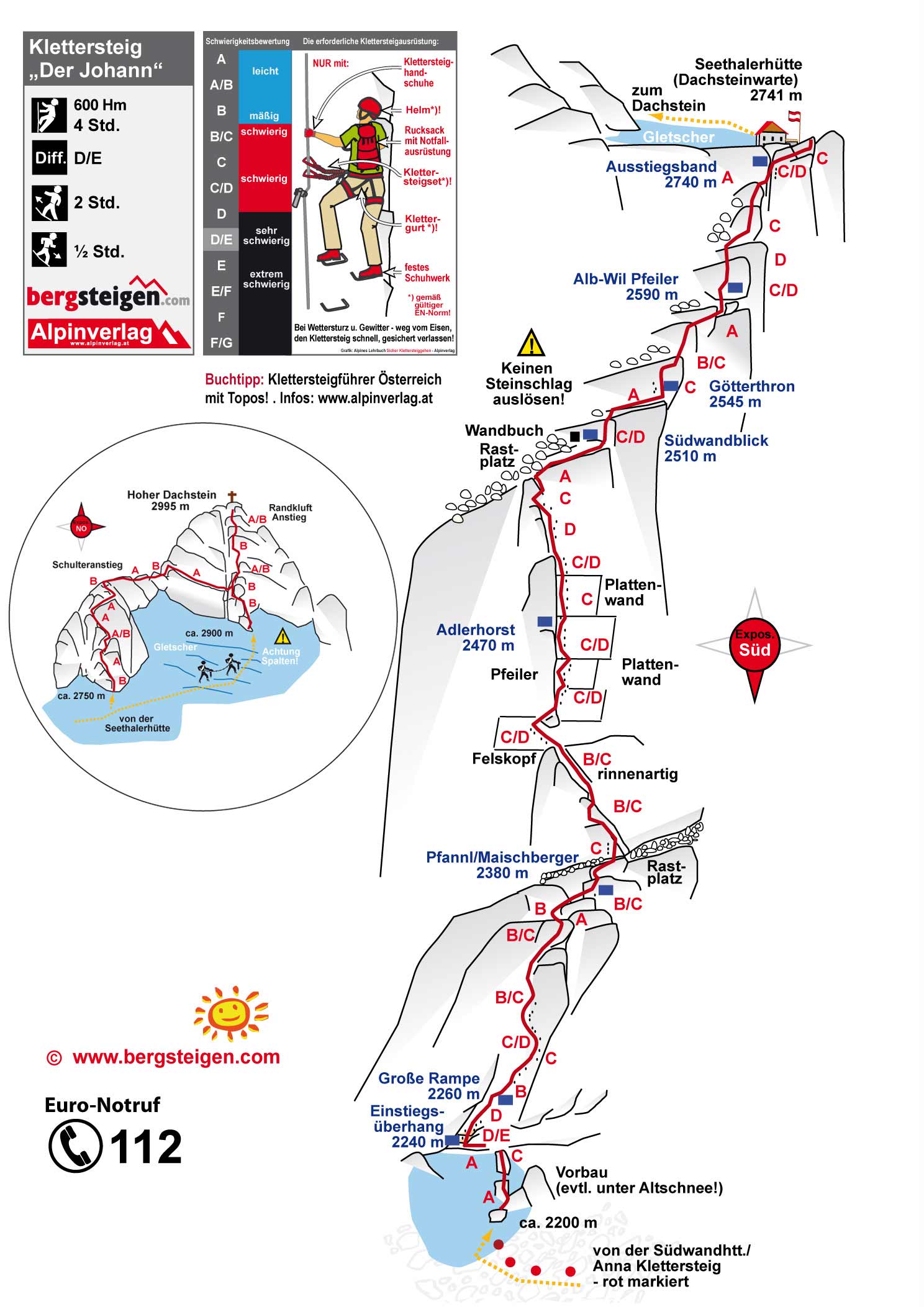 Zaliczana do top 3 ferrat w Europie o dużej skali trudności. Wyceniana na stopień D/E – bardzo trudna, jest częścią super ferraty czyli ferrat Anna, der Johann oraz Dachstein. Dojść do niej można po przyjechaniu autobusem (po zostawieniu auta na parkingu w Ramsau) przez schronisko Sudwandhuette. Ze schroniska prowadzi szlak, którym w godzinę dochodzi się do początku tej trudnej drogi wspinaczkowej. Ferrata na samym początku wita nas pionową ścianą i trudnym odcinkiem E. Dalej nie jest też łatwo. W ciągu trzech godzin (wg mapy czterech) pokonuje się 600 metrów w pionie po skale, często bez miejsca na odpoczynek. W połowie drogi przy dużym zmęczeniu i adrenalinie z trudności odeszła nam ekspozycja, ponieważ nakryła nas chmura, która zakryła piękne widoki. Na szczycie czekało na nas nowo wybudowane schronisko, gdzie nie mieliśmy czasu się zatrzymać, ponieważ musieliśmy przebiec lodowiec, aby zdążyć na ostatnią gondolę na dół. Inaczej skazani byśmy byli na trzy godzinny trekking w dół połączony z chodzeniem po ferracie (a to nie jest dobra kombinacja, chodzić po ferracie w dół). W nagrodę zostaliśmy na noc w schronisku na dole – Sudwandhuette, rozkoszując się przepięknym zachodem słońca w górach i spokojnym snem.