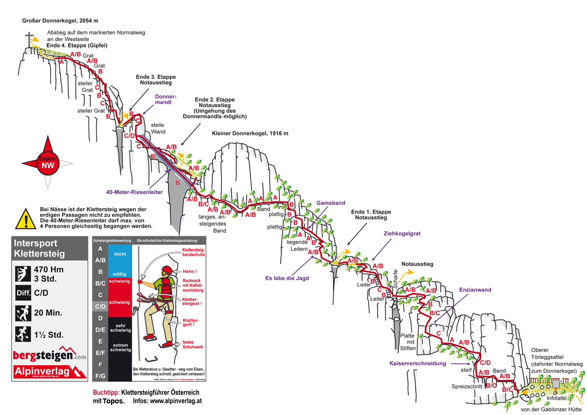 Nasza druga ferrata w tym tygodniu to widowiskowa droga żelazna nad jeziorem Gosauer, która kończy się na spektakularnym szczycie Donnerkogel. To jej częścią jest słynna 40 metrowa drabinka nad przepaścią, która rozpala wyobraźnię internatów. W rzeczywistości, ferrata jest co najmniej tak widowiskowa jak na zdjęciach i filmach. My mieliśmy świetną pogodę, to i wrażenia wizualne były jeszcze większe. Do drogi żelaznej można dojść w ciągu półtorej godziny marszu pod górę z jeziora Gosauersee. Ferrata wiedzie po wschodniej ścianie skał, aż do wyłonienia się łańcuchów przy Kleiner Donnerkogel w postaci wspomnianej drabinki. Nie da się ukryć, przejście nią to zadanie dla osób o żelaznej psychice. Jest duża ekspozycja, drabinka się trochę trzęsie, a po jej ukończeniu czeka nas 30 minut trudnej ferraty o skali C/D na grani. Po dojściu do szczytu, z którego rozciąga się przepiękny widok na okolicę schodzi się do schroniska Gablonzer Huette. W nim, na dole czekało na nas piwko satysfakcji oraz godzinny trek szlakiem pieszym na dół, do parkingu.